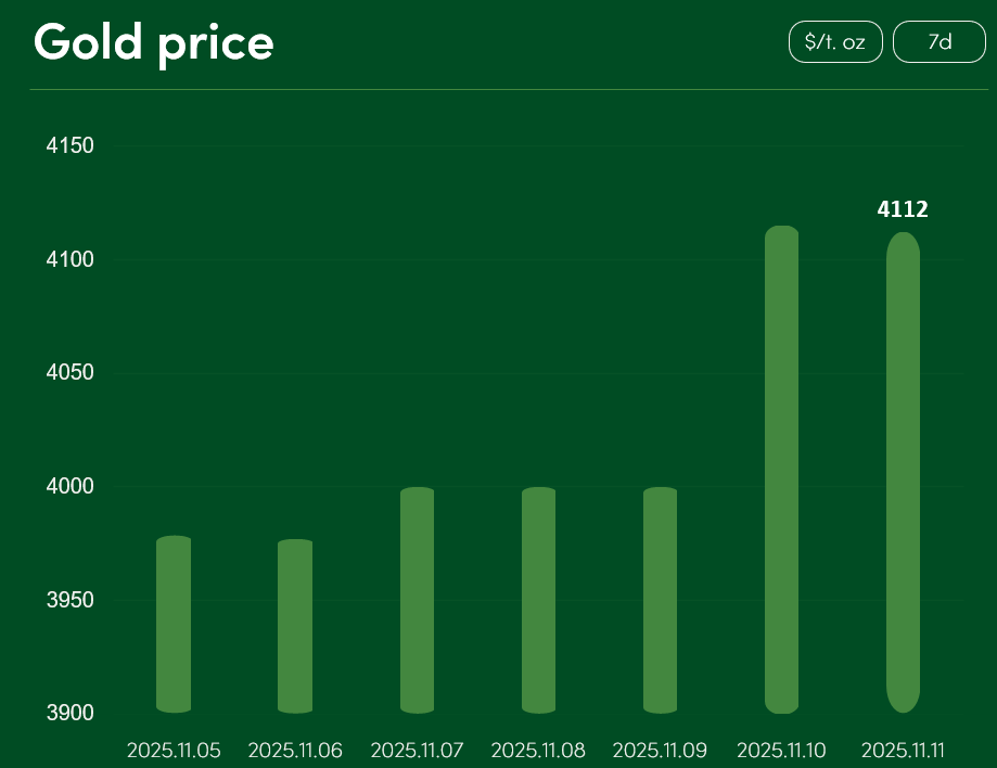 The global gold price rose by more than 3.2% from November 5 to November 11 and reached $4,112/t. oz.