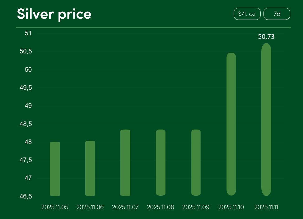 The global silver price increased by approximately 5.7% from November 5 to November 11 and reached $50.73/t. oz.