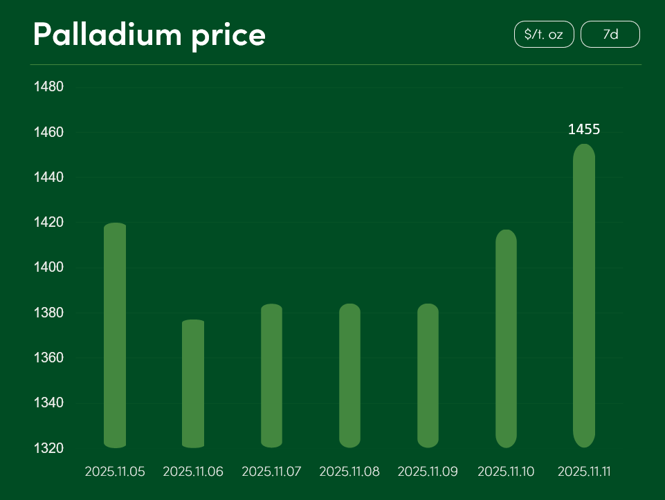 The global palladium price experienced minimal changes from November 5 to November 11, reaching $1,455/t. oz. on November 11.