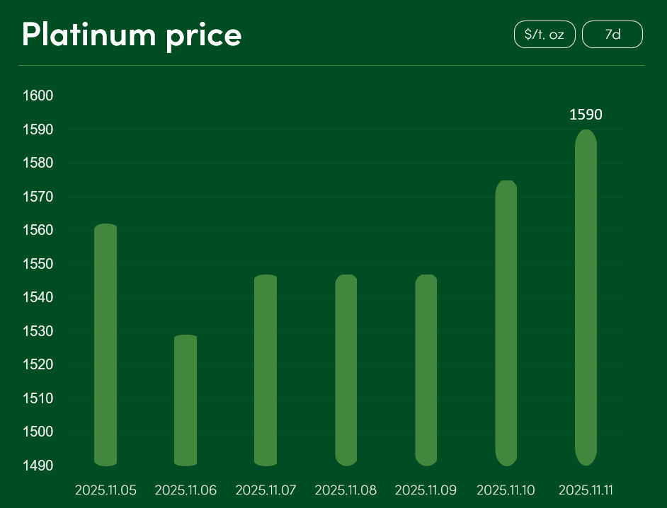 The global platinum price also showed minimal fluctuations, reaching $1,590/t. oz. on November 11.
