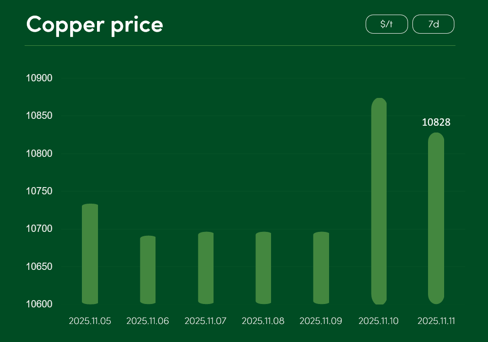 The global copper price rose by approximately 0.9% from November 5 to November 11 and reached $10,828 per tonne.