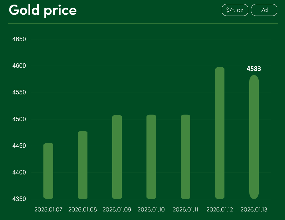 The global gold price rose by more than 2.8% last week, setting new all-time highs and reaching USD 4,583 per troy ounce on January 13.