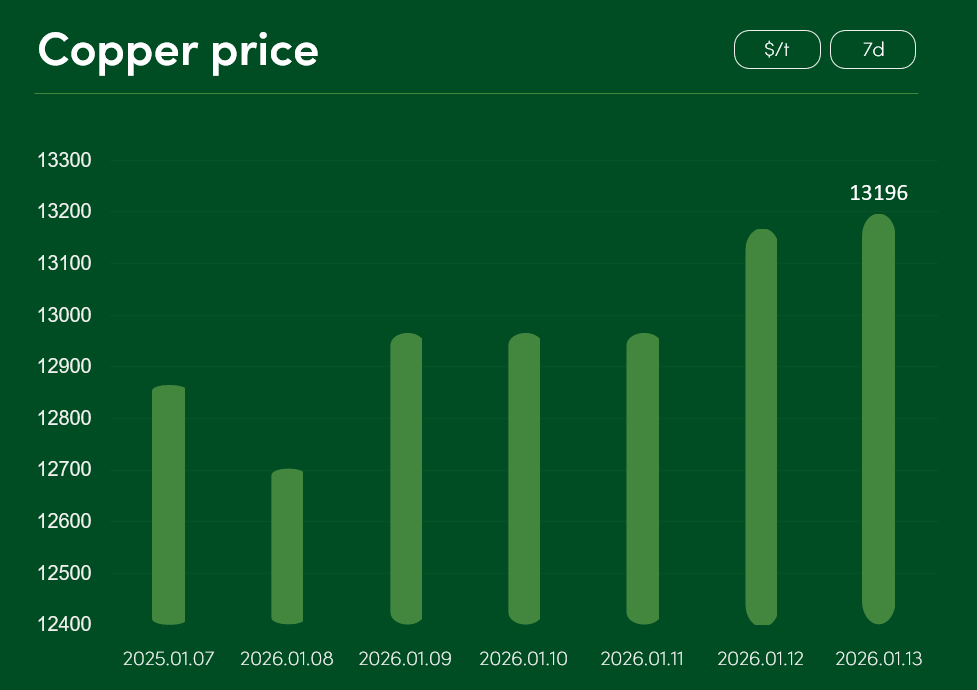The global copper price rose by more than 2.5% between January 7 and January 13, reaching USD 13,196 per tonne.