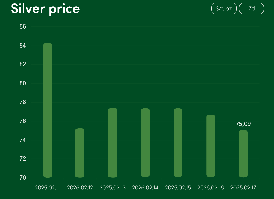 The global silver price fell by more than 10.9% between February 11 and February 17, reaching USD 75.09 per troy ounce. The average silver price in February stands at USD 82.33 per troy ounce.