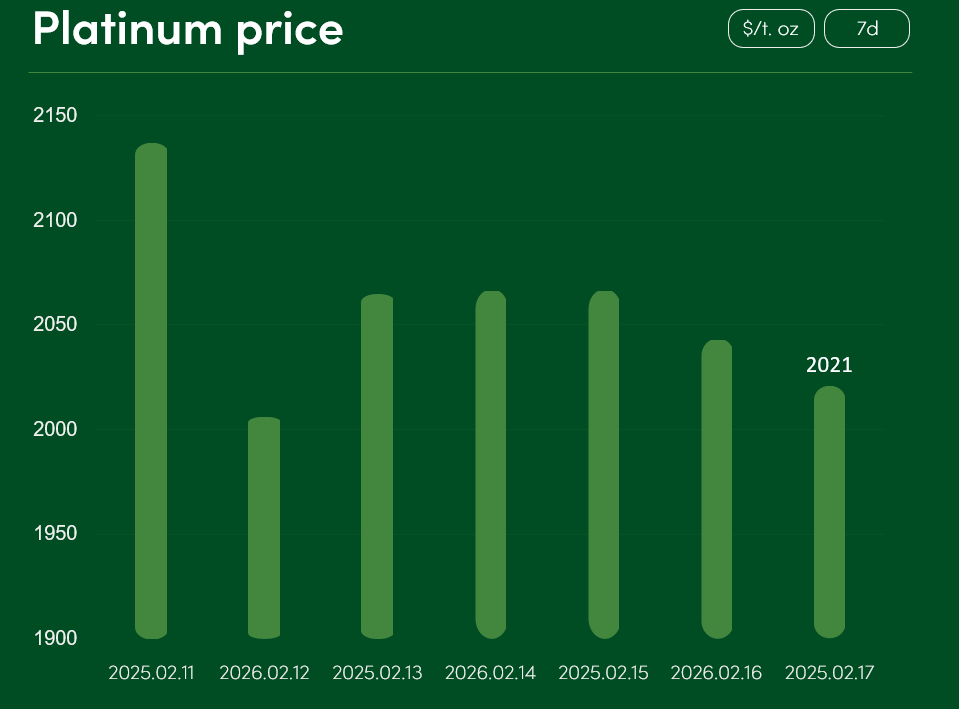 The global platinum price declined by 5.4% between February 11 and February 17, reaching USD 2,021 per troy ounce. The average platinum price in February stands at USD 2,131 per troy ounce.