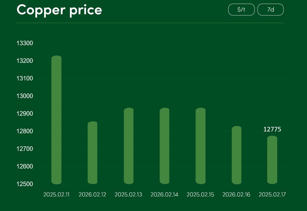 The global copper price fell by more than 3.2% between February 11 and February 17, reaching USD 12,775 per tonne.