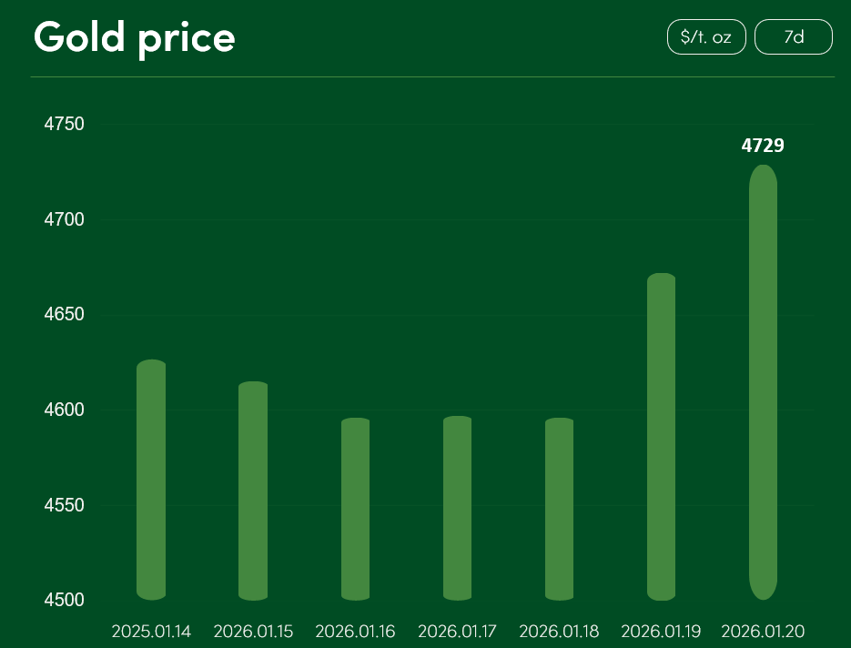 The global gold price rose by more than 2.2% between January 14 and January 20, reached a new all-time high during the period and climbed to USD 4,729 per troy ounce.