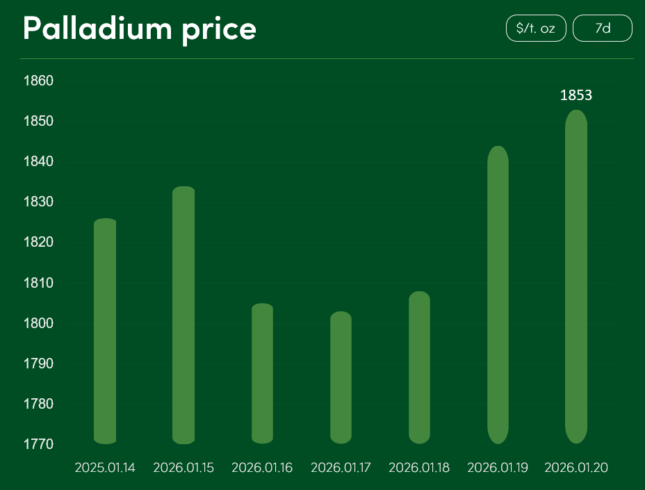 The global palladium price experienced minimal changes between January 14 and January 20. On January 20, palladium was priced at USD 1,853 per troy ounce.