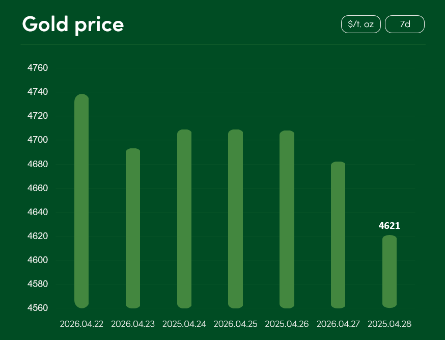 The global gold price declined by more than 2.4% from April 22 to April 28 and reached USD 4621 per troy ounce. The average gold price in April stands at USD 4751 per troy ounce.