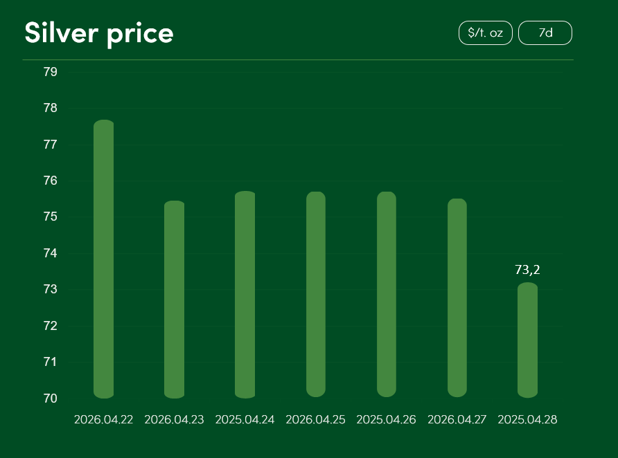 The global silver price declined by more than 5.7% from April 22 to April 28 and reached USD 73.2 per troy ounce. The average silver price in April stands at USD 76.2 per troy ounce.