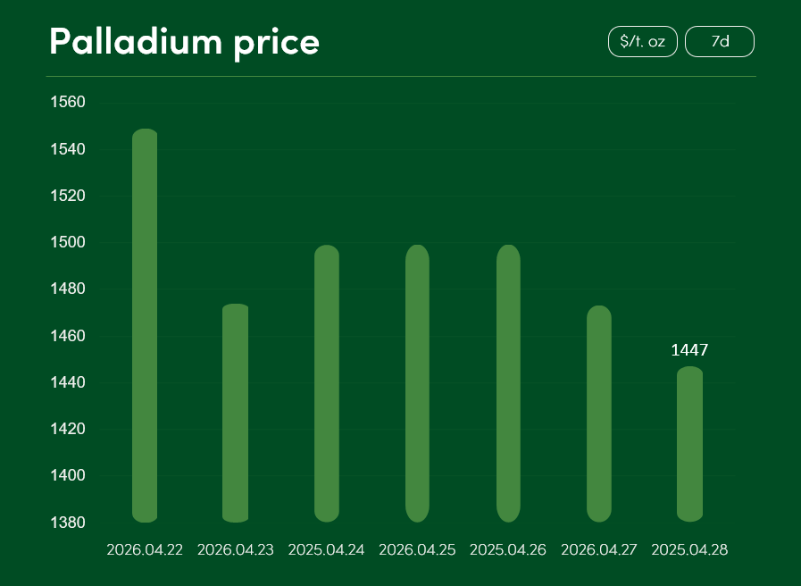 The global palladium price declined by more than 6.5% from April 22 to April 28 and reached USD 1447 per troy ounce. The average palladium price in April stands at USD 1531 per troy ounce.