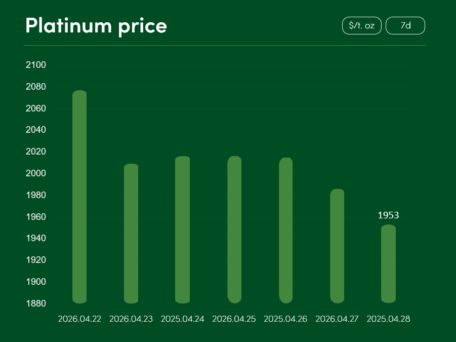 The global platinum price declined by more than 5.9% from April 22 to April 28 and reached USD 1953 per troy ounce. The average platinum price in April stands at USD 2043 per troy ounce.