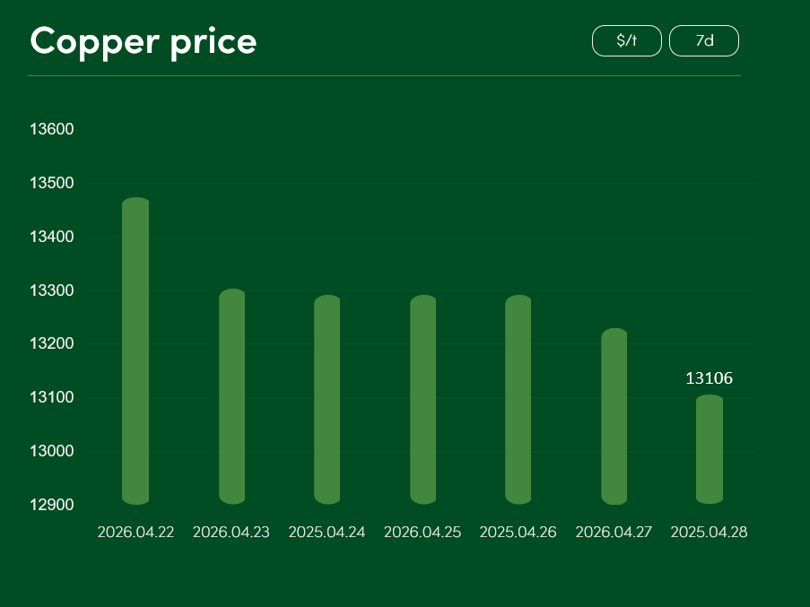 The global copper price declined by more than 2.6% from April 22 to April 28 and reached USD 13,106 per tonne.