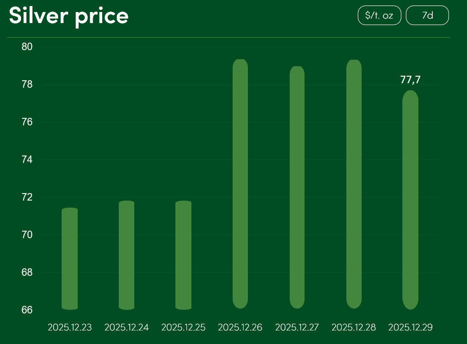 From December 23 to December 29, the global silver price increased by more than 8.8%. On December 29, the price of silver reached 77.7 USD per troy ounce.