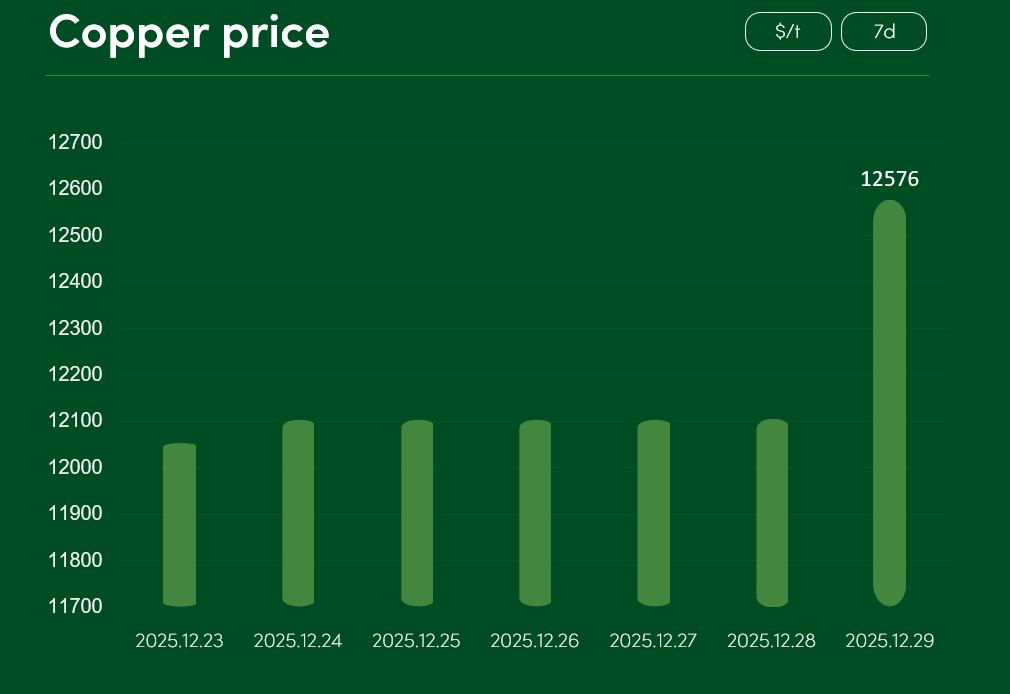 Over the past 7 days, the global copper price increased by more than 4.3%, reaching 12,576 USD per tonne.