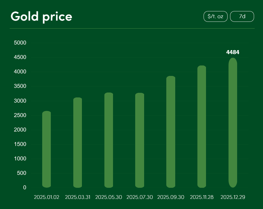 The global gold price increased by more than 68% over the course of the year. As 2025 drew to a close, the market price of the principal precious metal reached USD 4,484 per troy ounce.