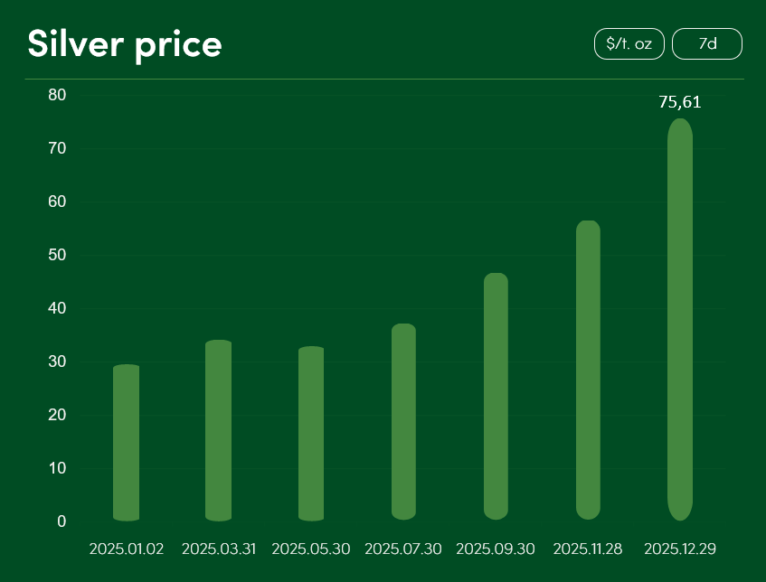 The global silver price rose by more than 156% in 2025. At the end of December, the market price of this precious metal reached USD 75.61 per troy ounce.