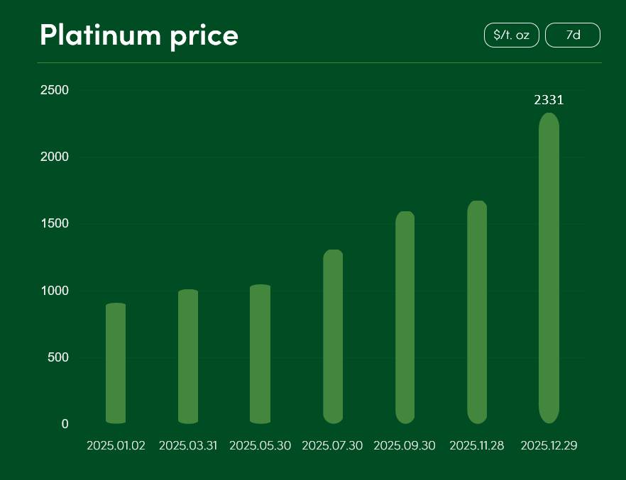 The global platinum price increased by more than 159% this year, reaching USD 2,331 per troy ounce at year-end.