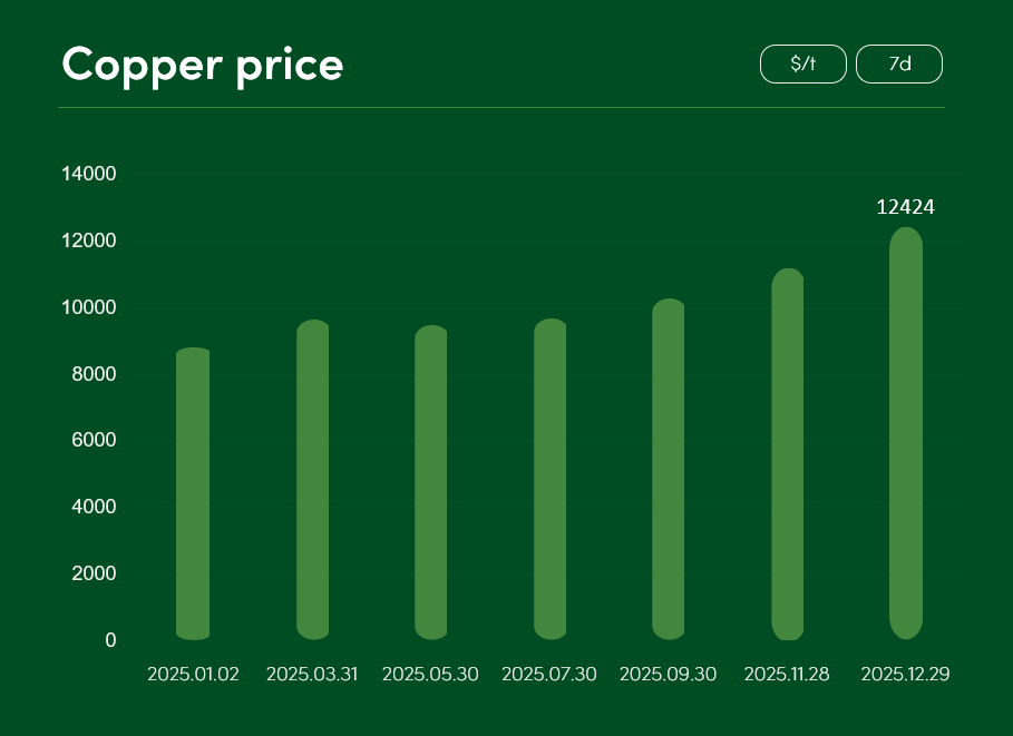 The global copper price rose by more than 41% in 2025, reaching USD 12,424 per tonne at the end of the year.
