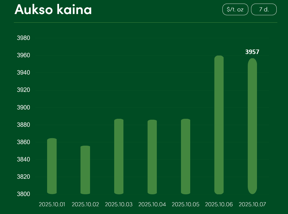 Pasaulinė aukso kaina nuo spalio 1 iki spalio 7 dienos augo >2,2 proc. ir pasiekė 3957 $/t. oz.