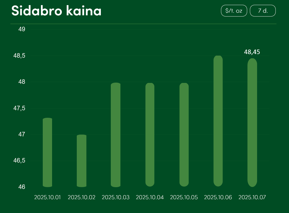 Pasaulinė sidabro kaina nuo spalio 1 iki spalio 7 dienos augo >2,3 proc. ir pasiekė 48,45 $/t. oz.