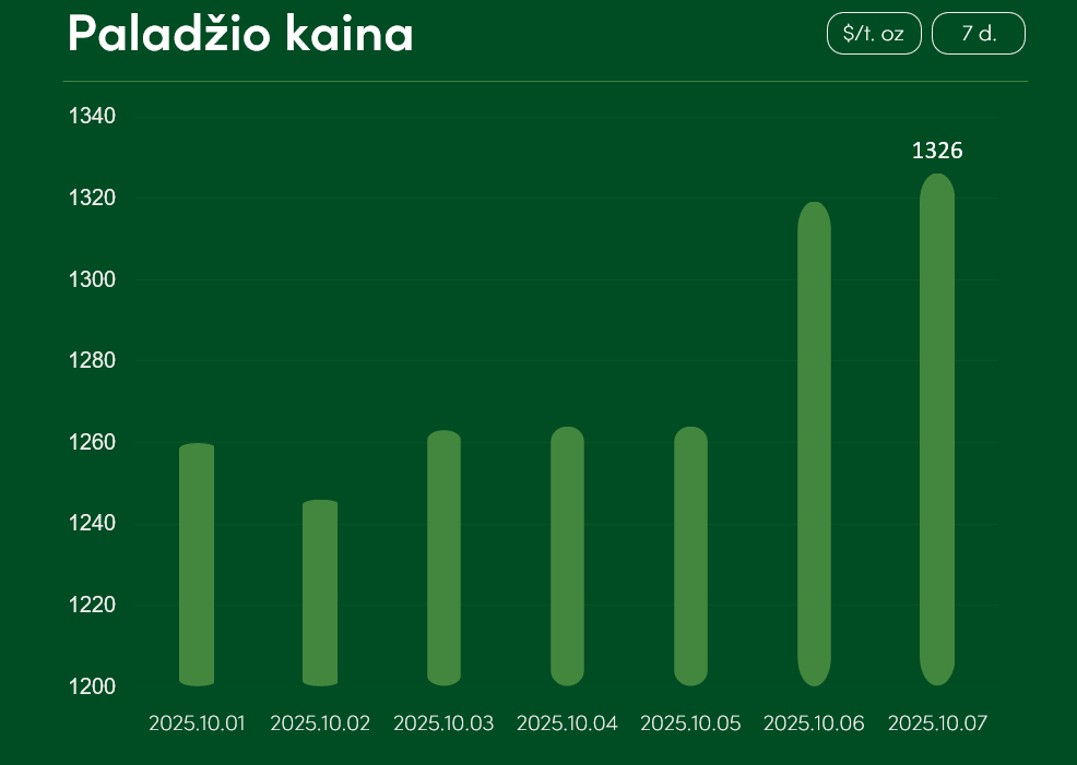 Pasaulinė paladžio kaina nuo spalio 1 iki spalio 7 dienos augo >5 proc. ir pasiekė 1326 $/t. oz.