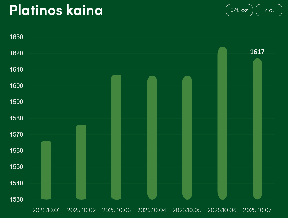 Pasaulinė platinos kaina nuo spalio 1 iki spalio 7 dienos augo >3,2 proc. ir pasiekė 1617 $/t. oz.