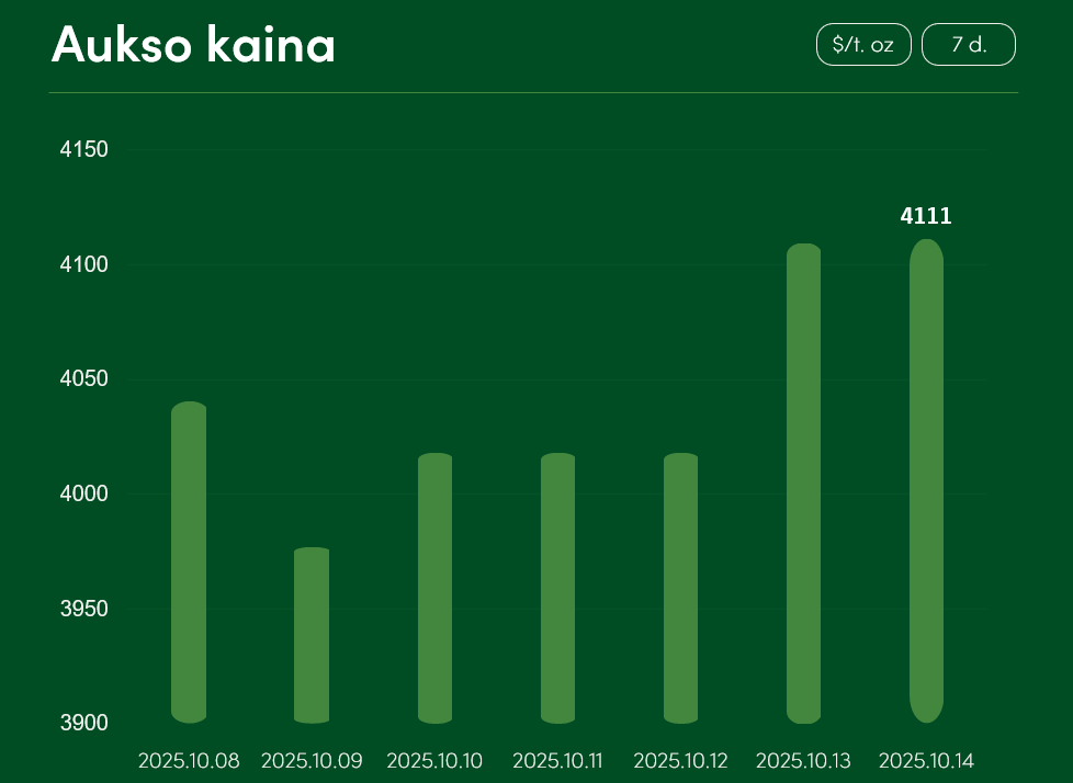 Pasaulinė aukso kaina nuo spalio 8 iki spalio 14 dienos augo >1,7 proc. ir pasiekė 4111 $/t. oz.
