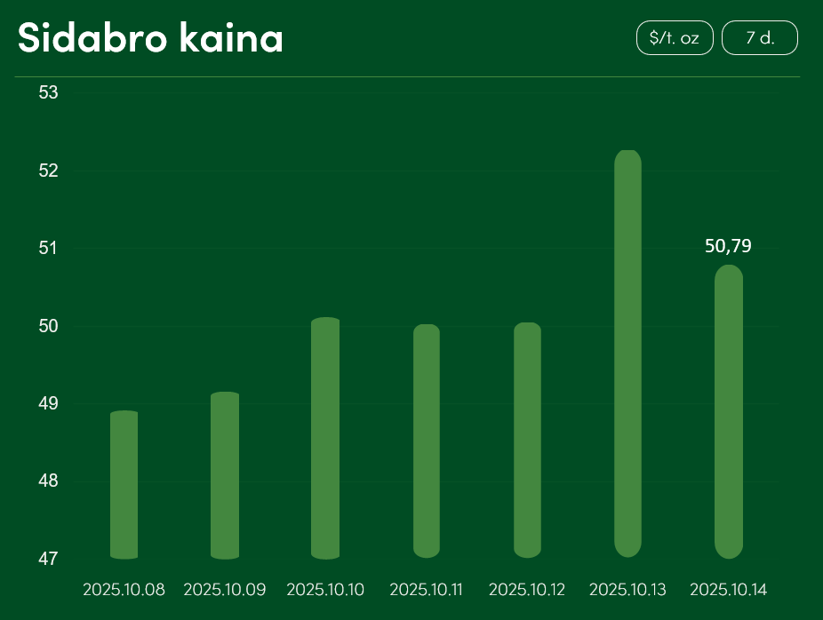 Pasaulinė sidabro kaina nuo spalio 8 iki spalio 14 dienos augo >3,8 proc. ir pasiekė 50,79 $/t. oz.