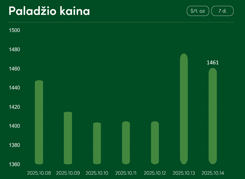 Pasaulinė paladžio kaina spalio 8 – spalio 14 dienos laikotarpiu fiksavo nežymų (~0,9 proc.) augimą ir pasiekė 1461 $/t. oz.
