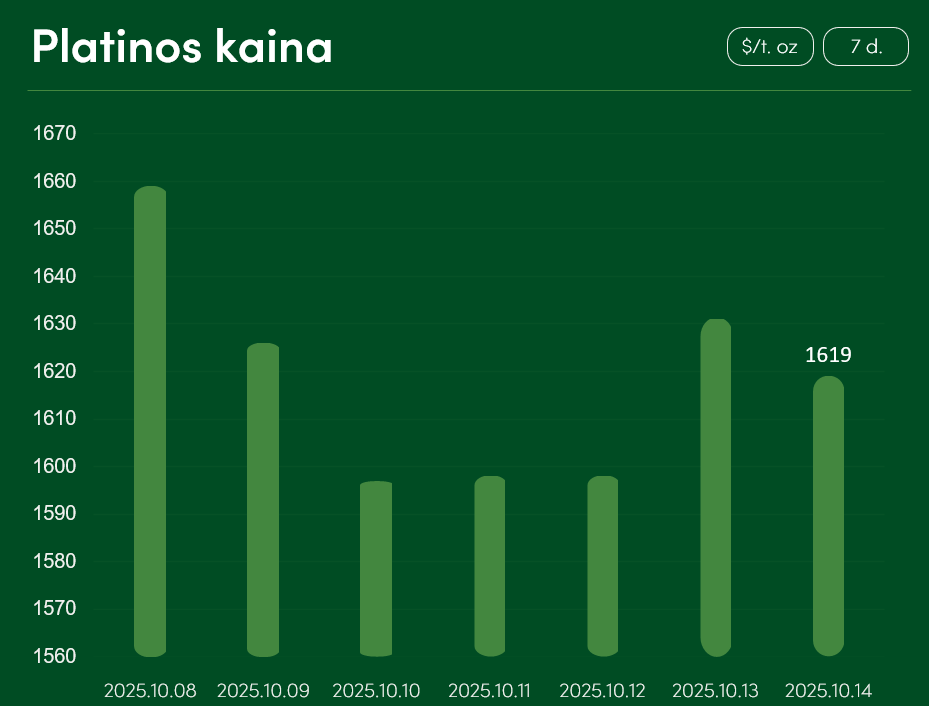 Pasaulinė platinos kaina per tą patį laikotarpį fiksavo ~2,4 proc. kainos korekciją ir pasiekė 1619 $/t. oz.