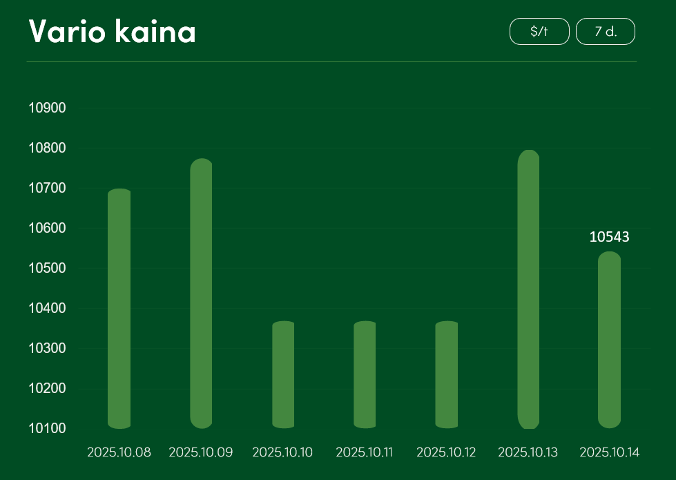 Pasaulinė vario kaina nuo spalio 8 iki spalio 14 dienos susidūrė su nežymiais kainos pokyčiais; spalio 14 dieną pasiektas 10543 $/t įkainis.