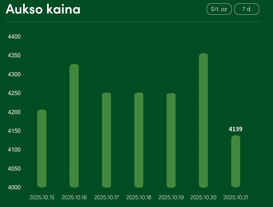 Pasaulinė aukso kaina nuo spalio 15 iki spalio 21 dienos susidūrė su >1,6 proc. korekcija. Spalio 21 dieną aukso kaina pasiekė 4139 $/t. oz.