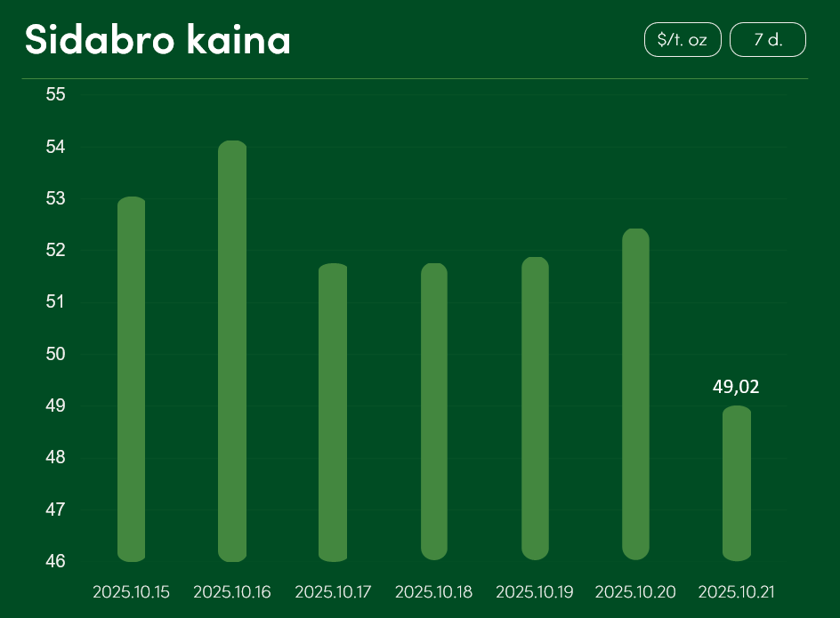 Pasaulinė sidabro kaina nuo spalio 15 iki spalio 21 susidūrė net su >7,5 proc. korekcija. Spalio 21 dieną sidabro kaina pasiekė 49,07 $/t. oz.