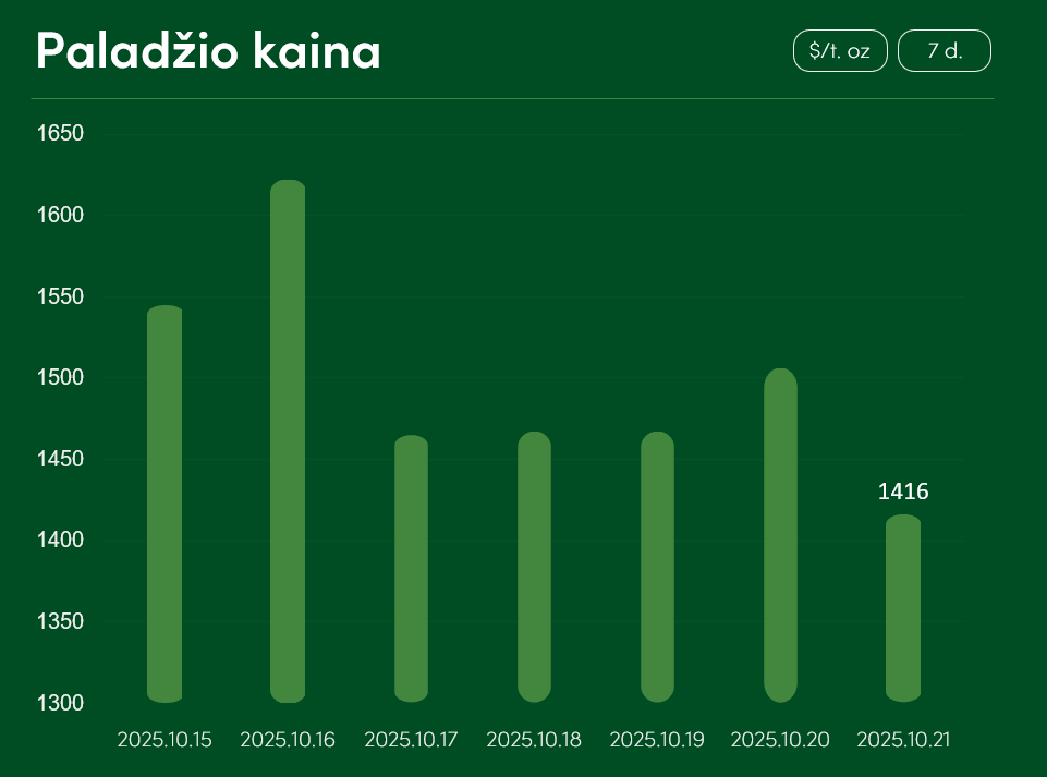 Pasaulinė paladžio kaina nuo spalio 15 iki spalio 21 dienos patyrė >8 proc. korekciją ir spalio 21 dieną pasiekė 1416 $/t. oz.