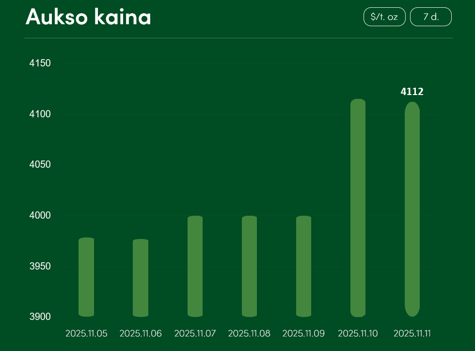 Pasaulinė aukso kaina nuo lapkričio 5 iki lapkričio 11 dienos augo >3,2 proc. ir pasiekė 4112 $/t. oz.