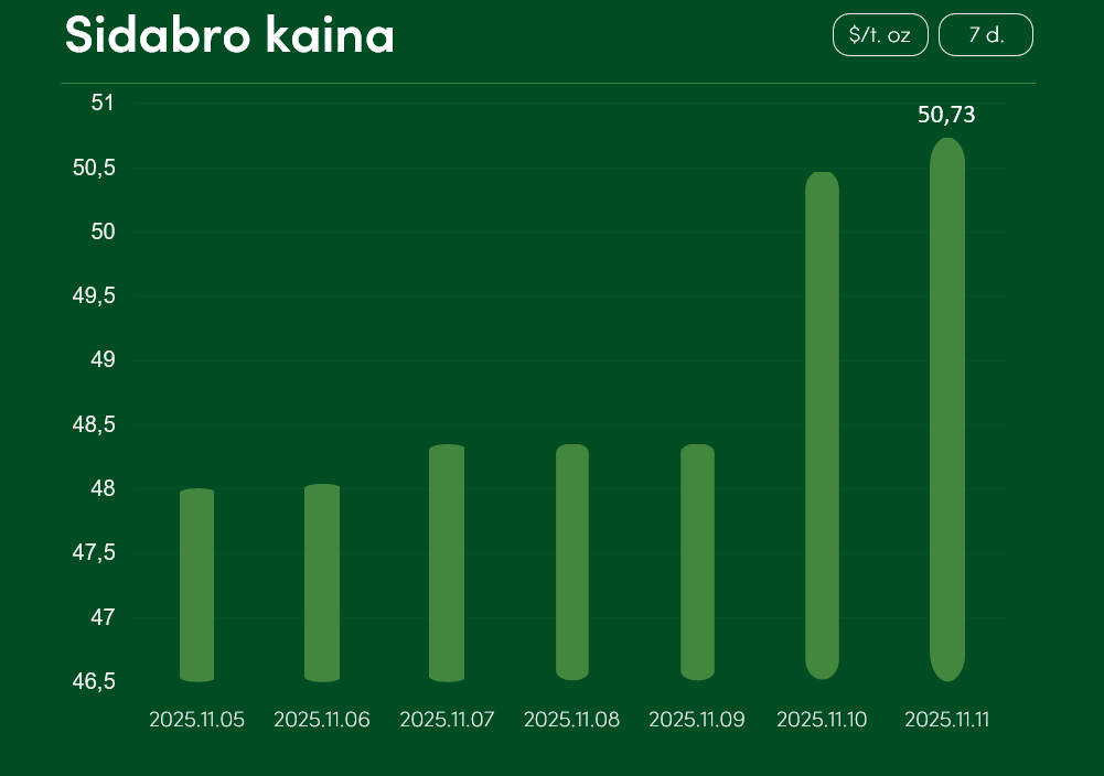 Pasaulinė sidabro kaina nuo lapkričio 5 iki lapkričio 11 dienos augo net ~5,7 proc. ir pasiekė 50,73 $/t. oz.