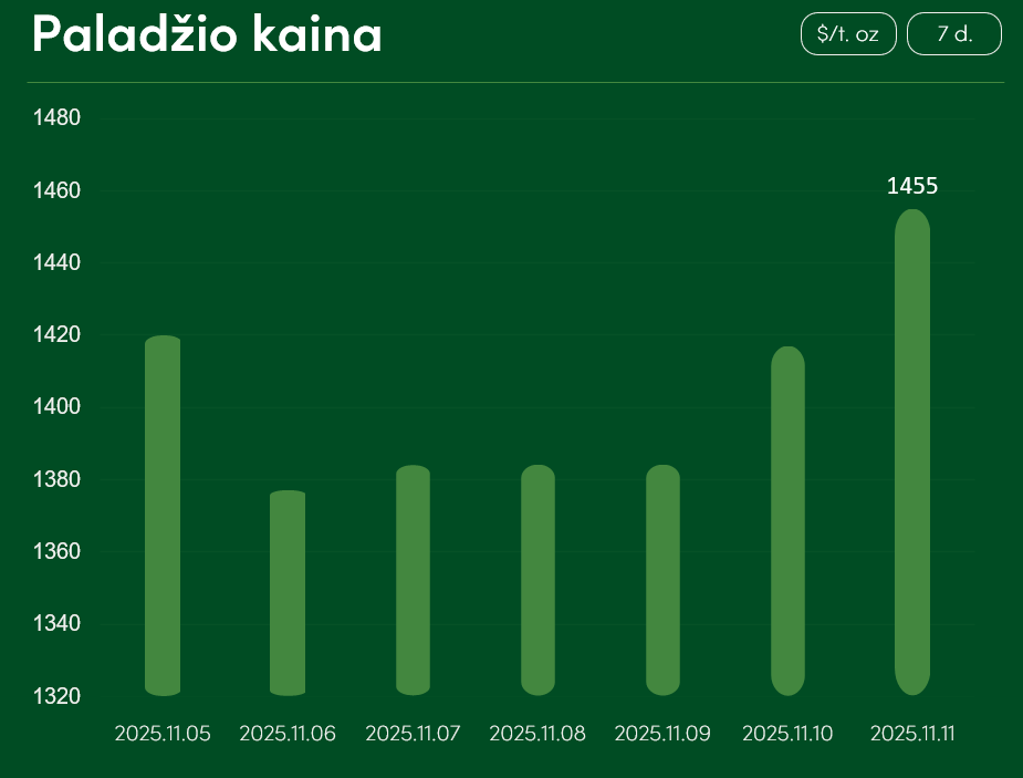 Pasaulinė paladžio kaina nuo lapkričio 5 iki lapkričio 11 dienos susidūrė su minimaliais pokyčiais. Lapkričio 11 dieną pasiektas 1455 $/t. oz įkainis.
