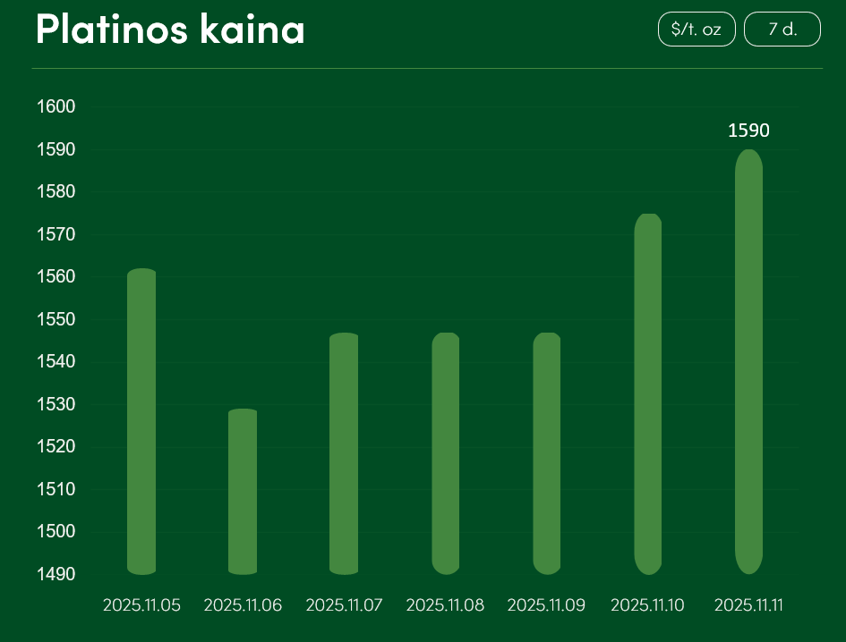 Pasaulinė platinos kaina per tą patį laikotarpį taip pat fiksavo minimalius kainos pokyčius. Lapkričio 11 dieną šio metalo kaina rinkose pasiekė 1590 $/t. oz.