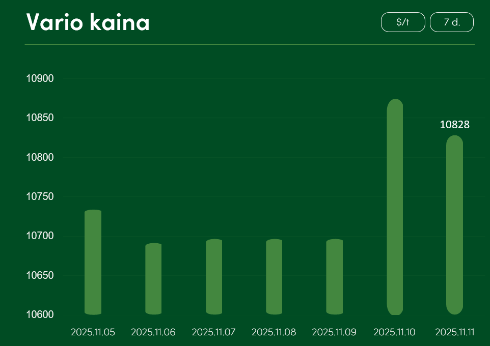 Pasaulinė vario rinkos kaina nuo lapkričio 5 iki lapkričio 11 dienos augo ~0,9 proc. ir pasiekė 10828 $/t.