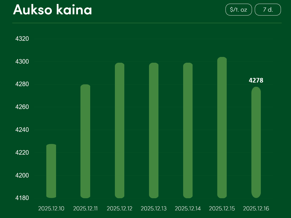 Nuo gruodžio 10 iki gruodžio 16 dienos pasaulinė aukso kaina augo ~1,2 proc. ir pasiekė 4278 $/t. oz.
