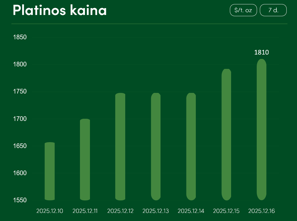 Pasaulinė platinos kaina tuo pat metu išaugo >9 proc. ir pasiekė 1810 $/t. oz.