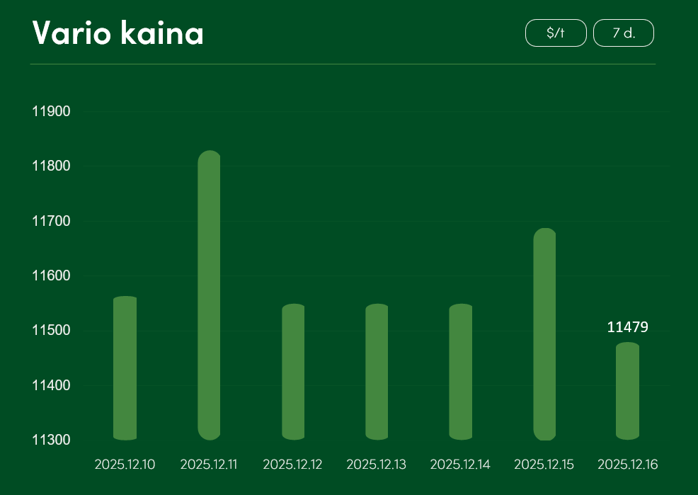 Pasaulinė vario kaina nuo gruodžio 10 iki gruodžio 16 dienos fiksavo minimalius kainos pakitimus. Gruodžio 16 dieną vario kaina rinkoje pasiekė 11479 $/t.