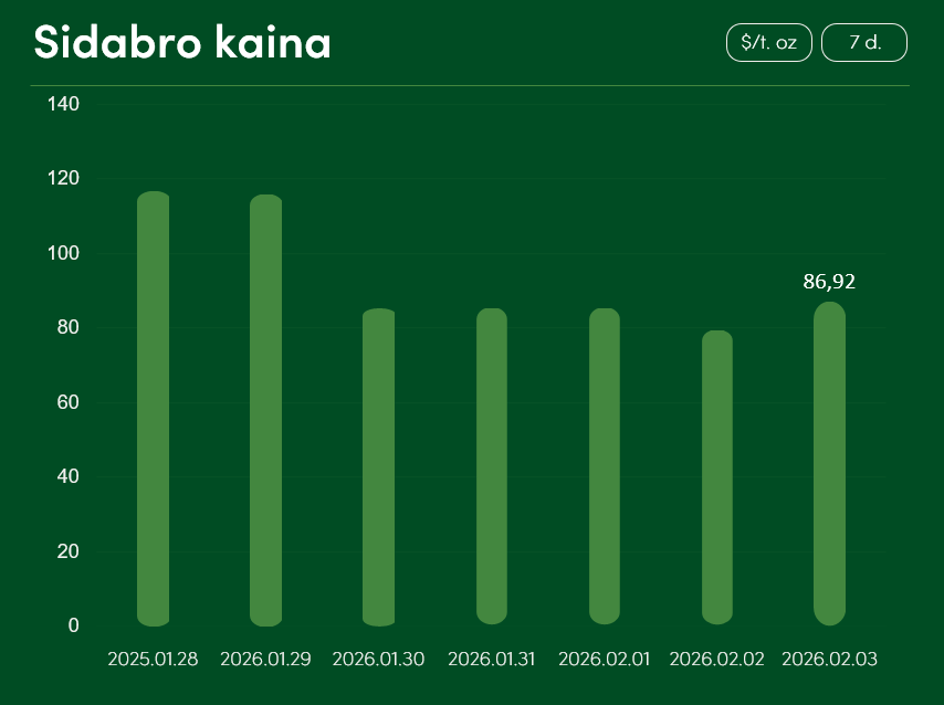 Pasaulinė sidabro kaina nuo sausio 28 iki vasario 3 dienos krito daugiau, nei 25 proc. Vasario 3 dieną sidabro kaina pasiekė 86,92 USD už Trojos unciją. Bendras sidabro kainos vidurkis 2026 m. sausį siekė 92,13 USD už Trojos unciją.