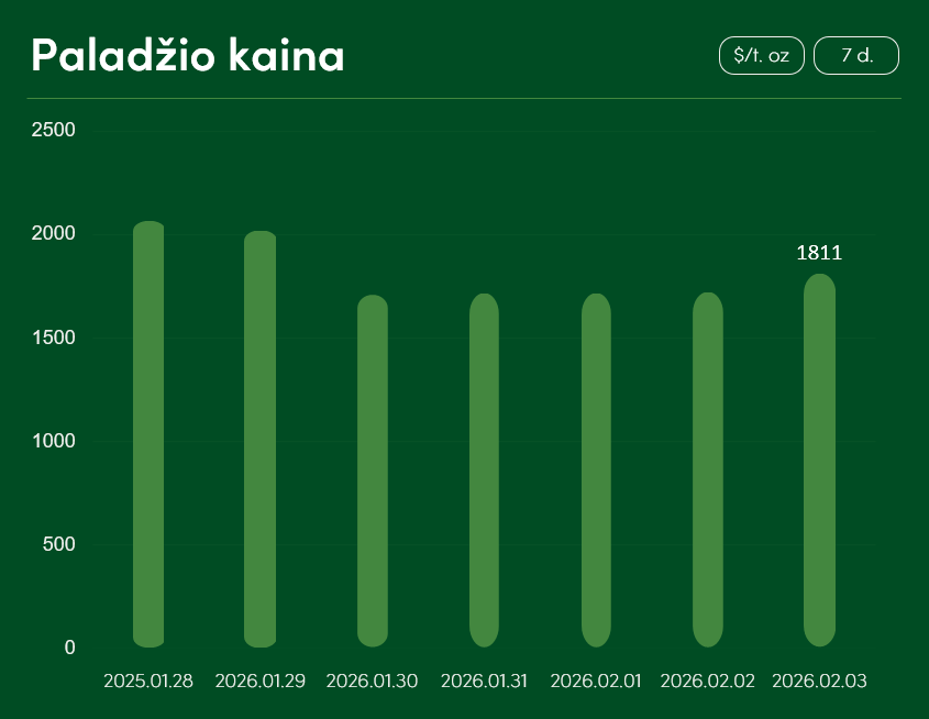 Pasaulinė paladžio kaina nuo sausio 28 iki vasario 3 dienos sumažėjo daugiau, nei 12 proc. ir pasiekė 1811 USD už Trojos unciją. Bendras paladžio kainos vidurkis 2026 m. sausį siekė 1854 USD už Trojos unciją.