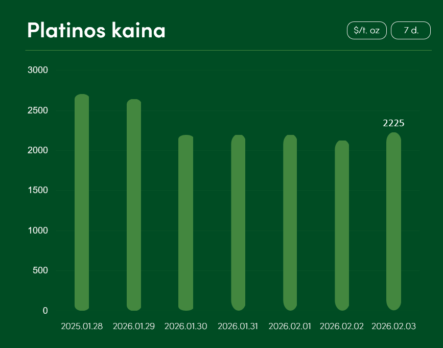 Pasaulinė platinos kaina nuo sausio 28 iki vasario 3 dienos sumažėjo daugiau, nei 17 proc. ir pasiekė 2225 USD už Trojos unciją. Bendras platinos kainos vidurkis 2026 m. sausį siekė 2432 USD už Trojos unciją.