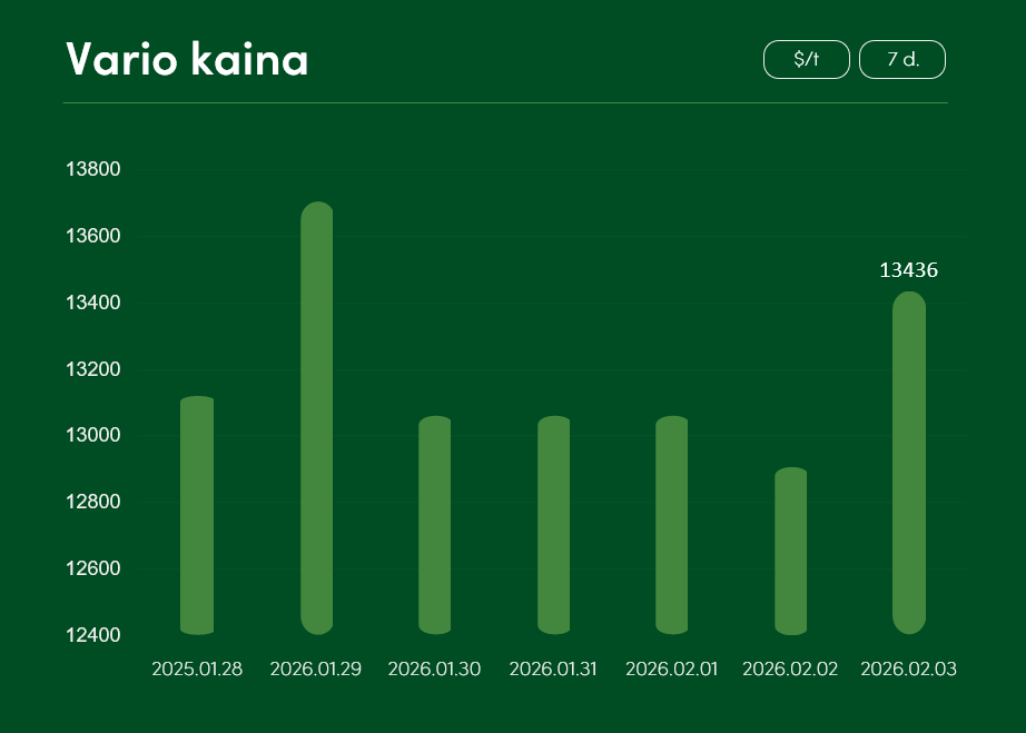 Pasaulinė vario kaina nuo sausio 28 iki vasario 3 dienos augo daugiau, nei 2,3 proc. ir pasiekė 13436 USD už toną.