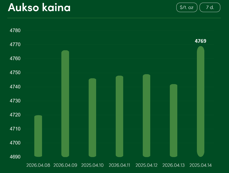 Pasaulinė aukso kaina nuo balandžio 8 iki balandžio 14 dienos augo daugiau, nei 1 proc. ir pasiekė 4769 USD už Trojos unciją. Vidutinė aukso kaina balandžio mėnesį siekia 4719 USD už Trojos unciją.