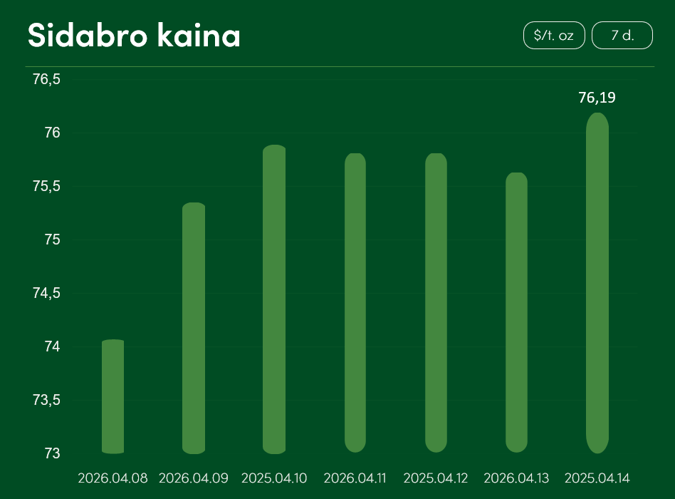 Pasaulinė sidabro kaina nuo balandžio 8 iki balandžio 14 dienos augo daugiau, nei 2,8 proc. ir pasiekė 76,19 USD už Trojos unciją. Vidutinė sidabro kaina balandžio mėnesį siekia 74,06 USD už Trojos unciją.