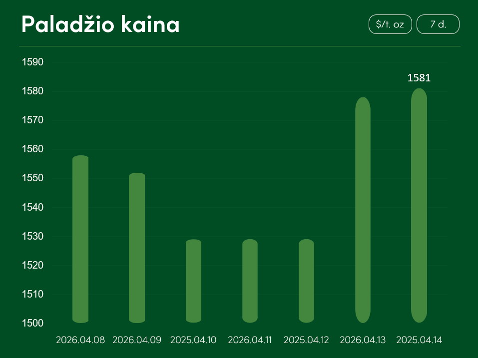 Pasaulinė paladžio kaina nuo balandžio 8 iki balandžio 14 dienos patyrė daugiau, nei 1,4 proc. augimą ir pasiekė 1581 USD už Trojos unciją. Vidutinė paladžio kaina balandžio mėnesį siekia 1511 USD už Trojos unciją.